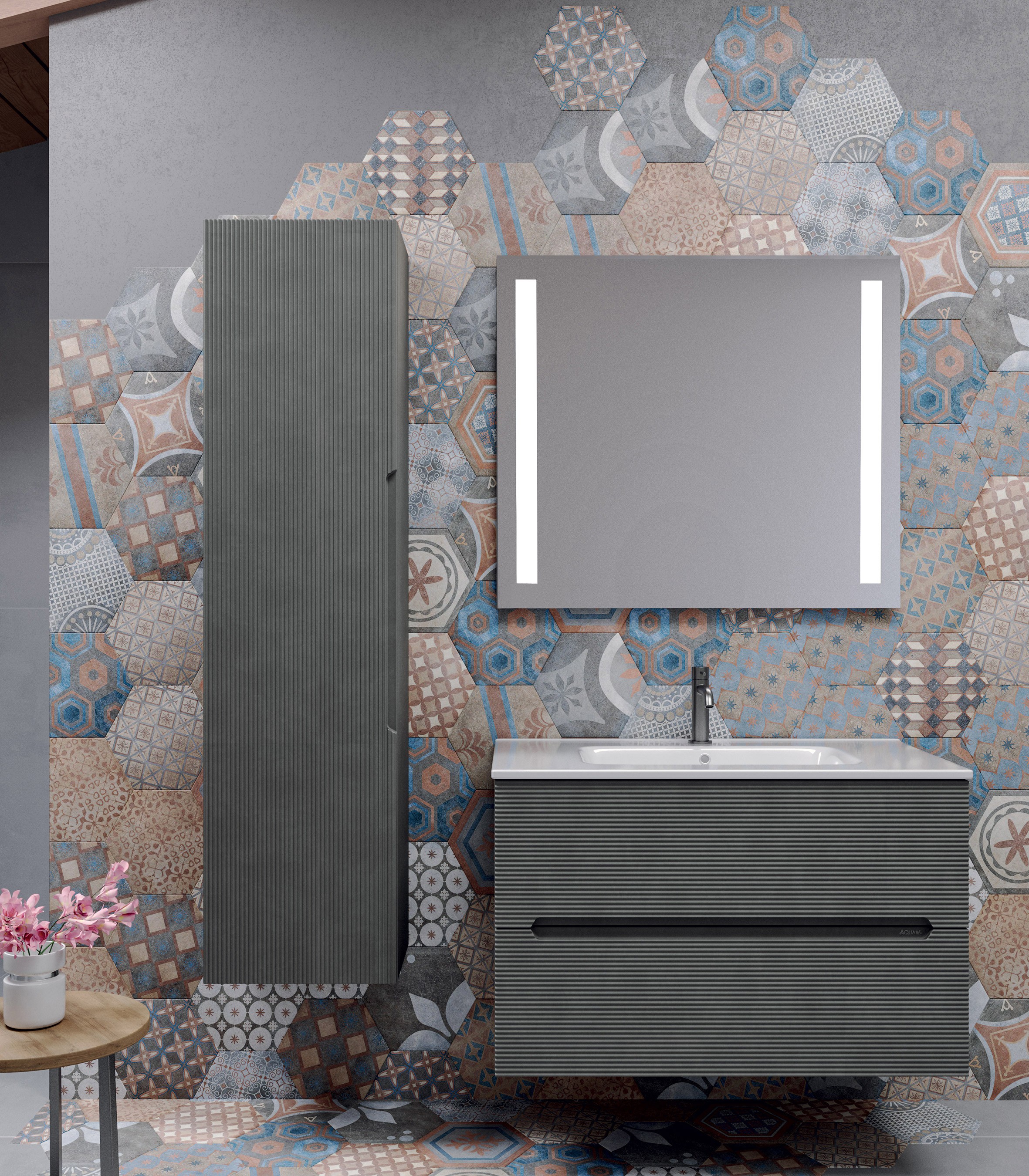 MOB522 Base sospesa portalavabo 2 cassetti IKON 80 - L80xH50xP45 struttura in agglomerato di legno con superficie in lamina melaminica in finitura legno con venatura in rilievo o cemento con texture in rilievo.