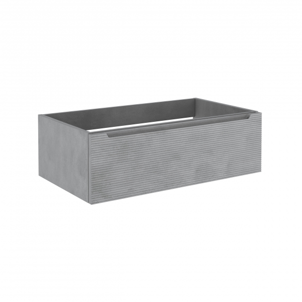 Base sospesa portalavabo 1 cassetto, struttura in agglomerato di legno con superficie in lamina melaminica in finitura legno con venatura in rilievo o cemento con texture in rilievo.