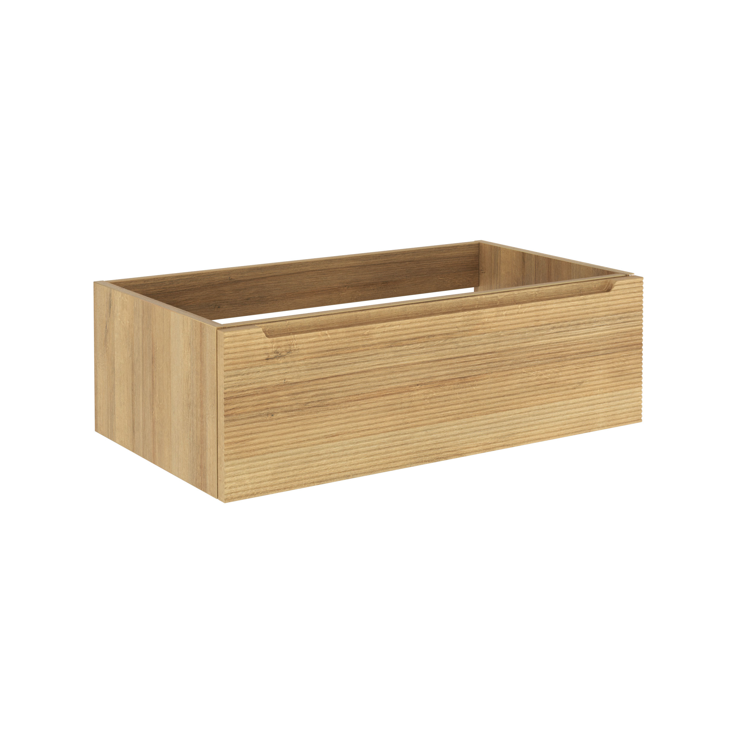 Base sospesa portalavabo 1 cassetto, struttura in agglomerato di legno con superficie in lamina melaminica in finitura legno con venatura in rilievo o cemento con texture in rilievo.