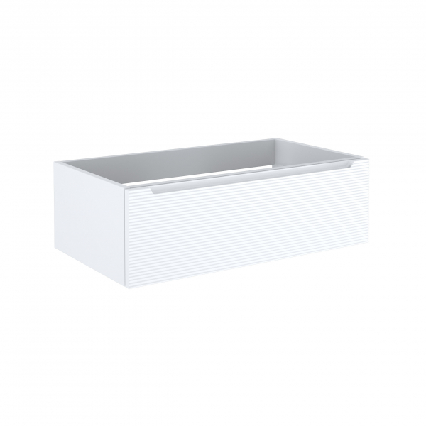 Base sospesa portalavabo 1 cassetto, struttura in agglomerato di legno con superficie in lamina melaminica in finitura legno con venatura in rilievo o cemento con texture in rilievo.