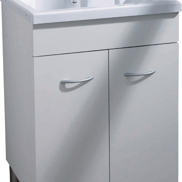 Sottolavatoio in materiale idrofugo spessore 18mm a 2 ante color bianco, completo di lavatoio in acrilico, sifone, piletta e asse lavatoio in legno.