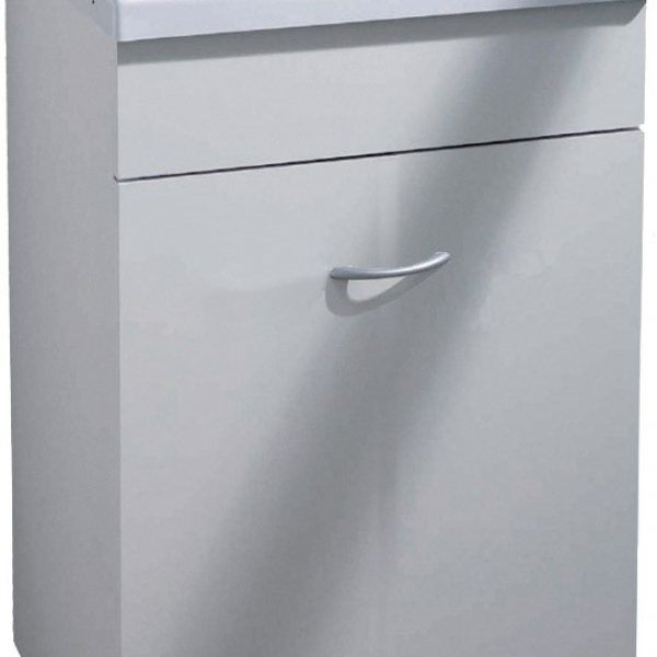 Sottolavatoio in materiale idrofugo spessore 18mm a 1 anta (apertura a DX) color bianco, completo di lavatoio in acrilico, sifone, piletta e asse lavatoio in legno.