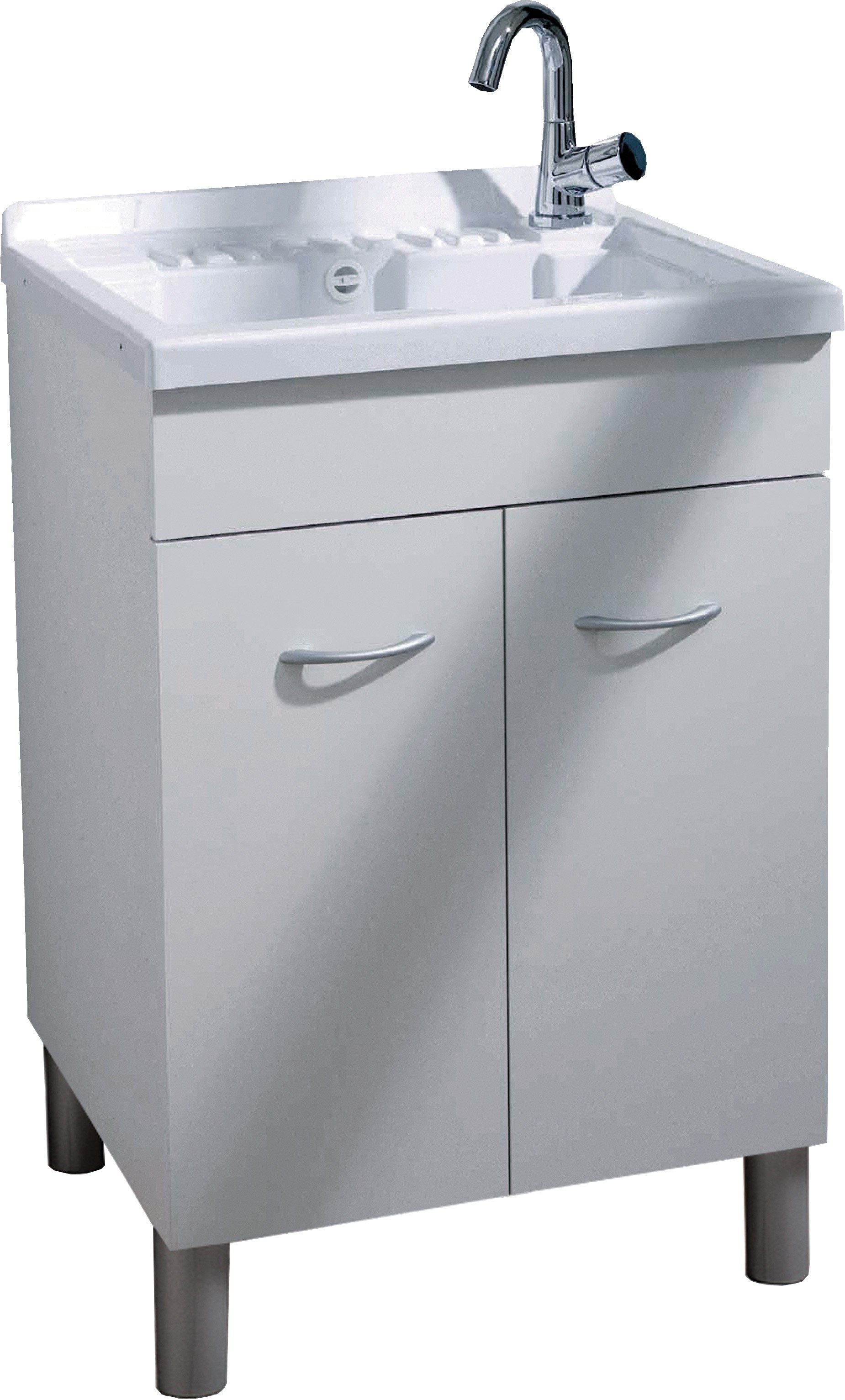 Sottolavatoio in materiale idrofugo spessore 18mm a 2 ante color bianco, completo di lavatoio in acrilico, sifone, piletta e asse lavatoio in legno.
