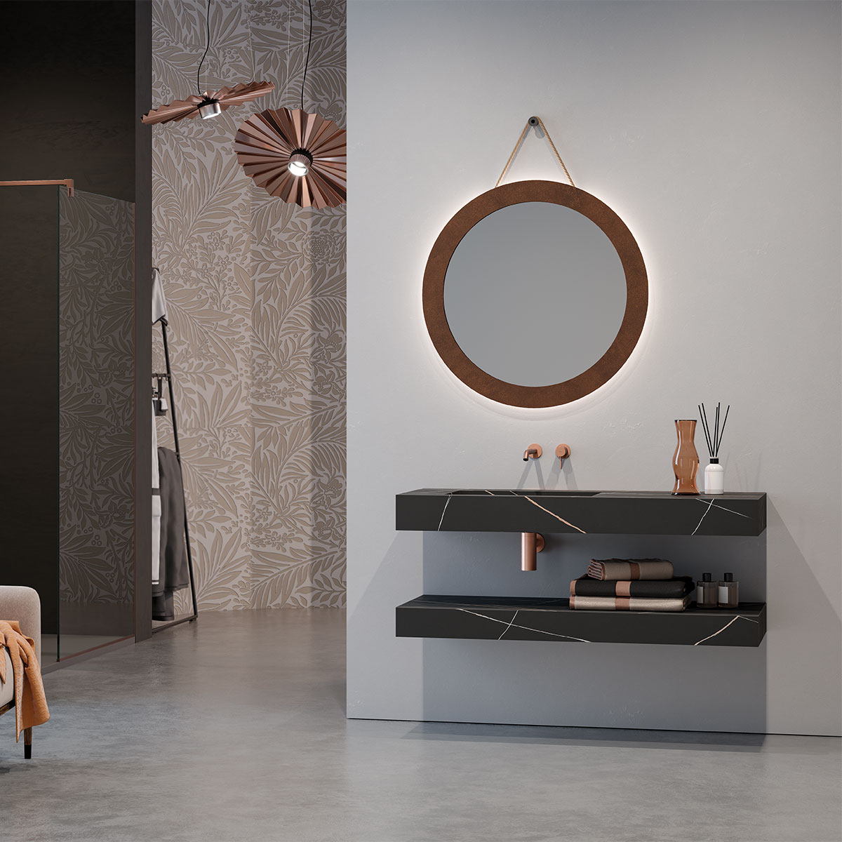 Specchio TWIN in acciaio finitura CORTEN con perimetro retroilluminato led e corda in juta