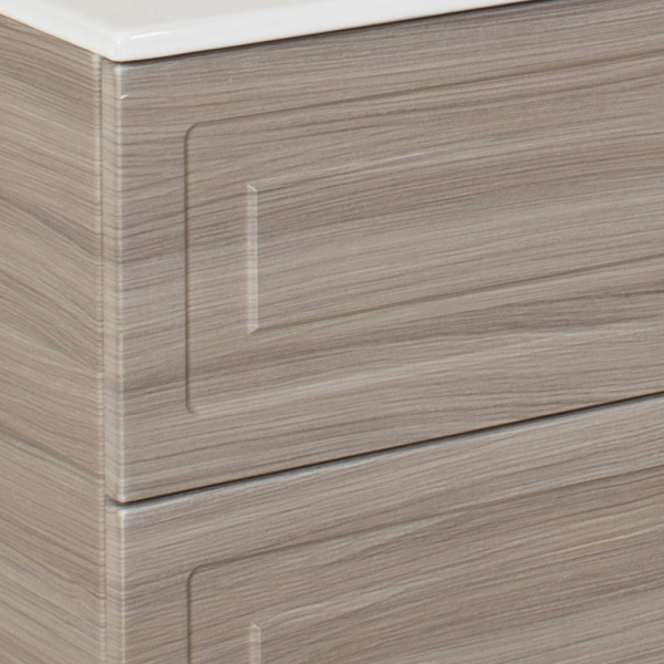 Struttura realizzata in MDF da 1,9 cm con rivestimento in pvc finitura legno. Mobile sospeso portalavabo a 2 cassetti soft close