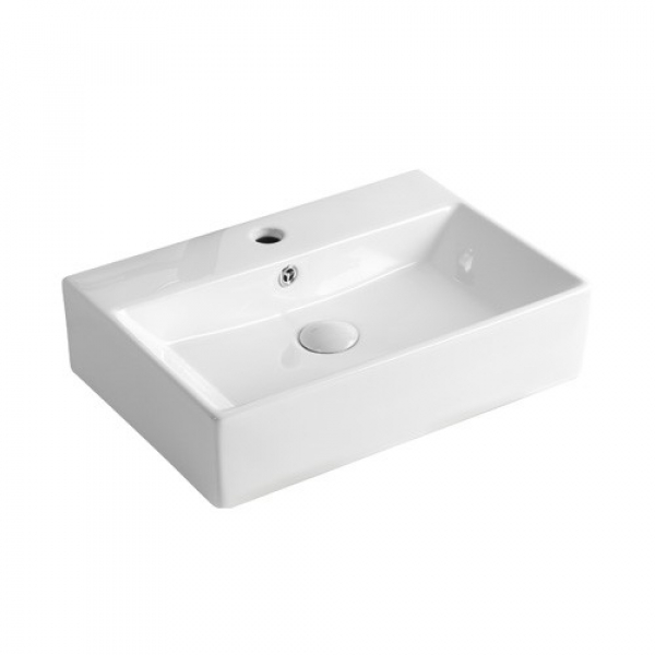 Lavabo in ceramica ad appoggio o sospeso per rubinetteria monoforo, con troppo pieno e senza piletta.