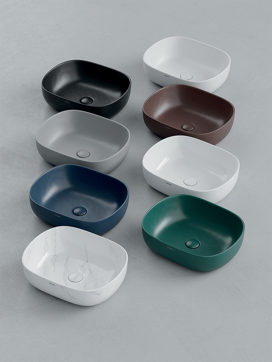 Senza foro rubinetteria, senza troppo pieno e senza piletta, in 4 colorazioni.