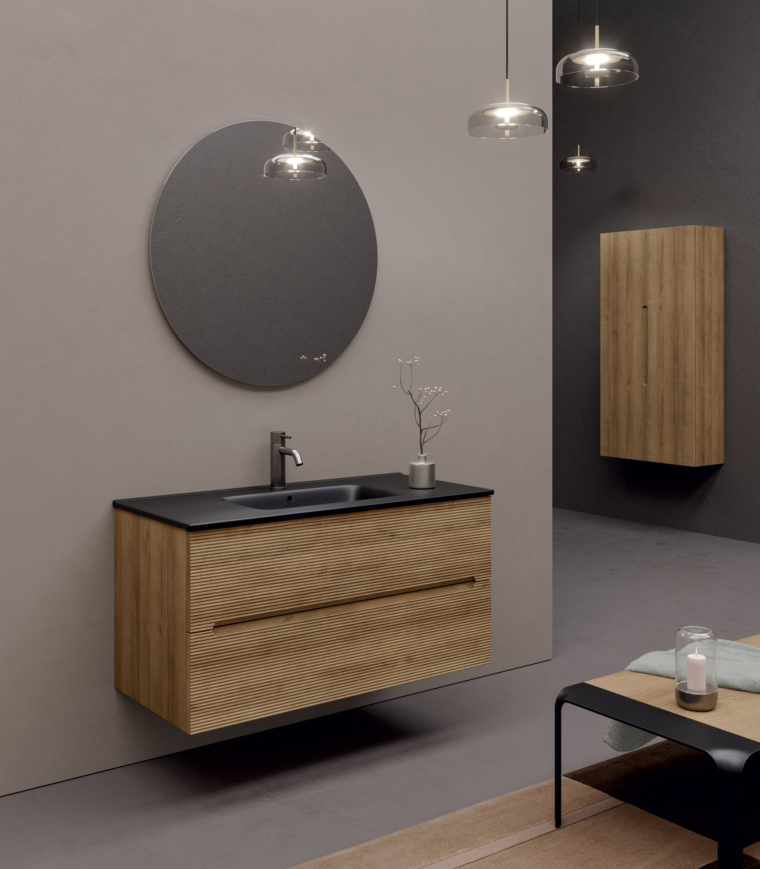 MOB864 Base sospesa portalavabo 2 cassetti IKON 100 - L100xH50xP45 - struttura in agglomerato di legno con superficie in lamina melaminica in finitura legno con venatura in rilievo o cemento con texture in rilievo.