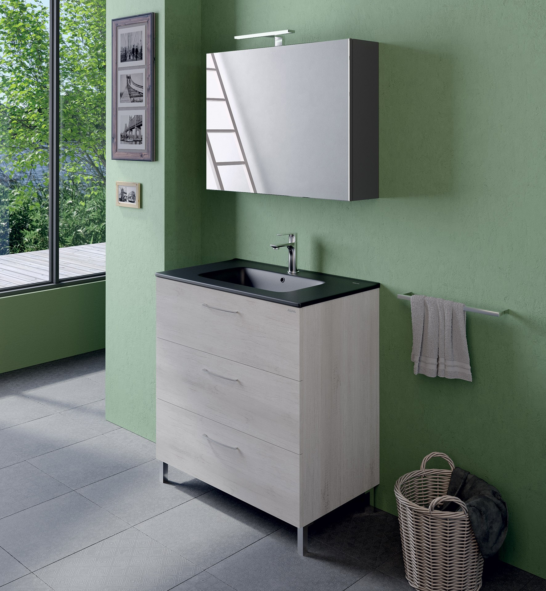 MOB343 Mobile portalavabo con piedi LEAF 80 - L.80xH.84xP.45,5 con piedi a 3 cassetti chiusura soft close, con maniglia in metallo.