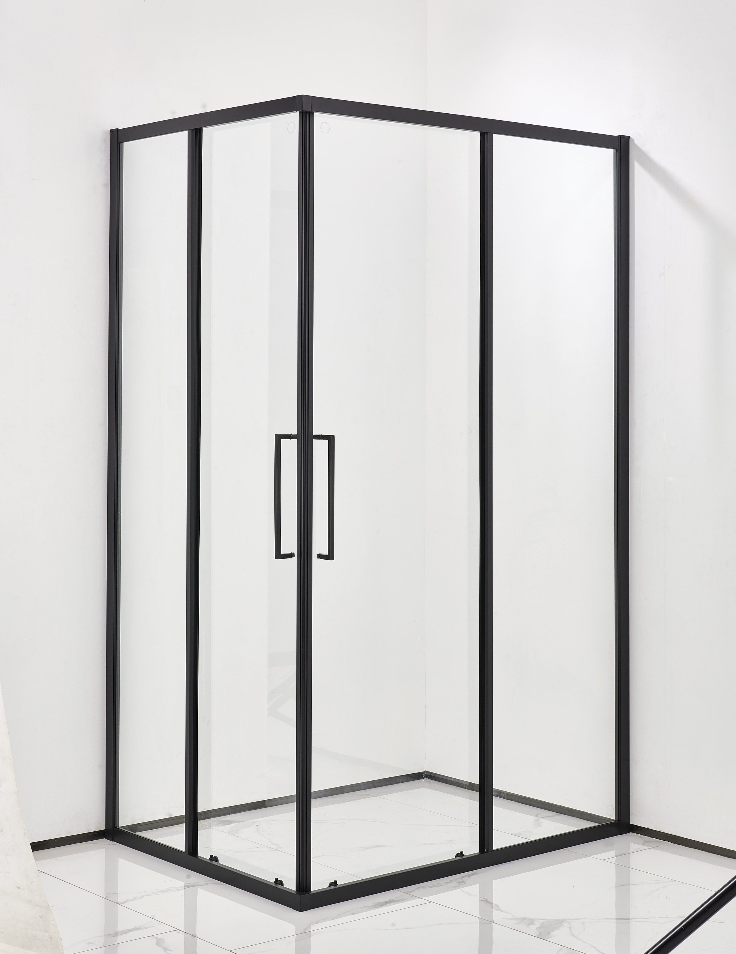 Apertura scorrevole su carrelli in metallo a doppia ruota con copriruota in teflon, chiusura magnetica, lastre in Cristallo temperato da 6 mm Trasparente, dispositivo sgancio con pulsante. Profilo in alluminio minimal 37 mm spessore 1,2mm color Nero Opaco. Maniglie minimal in metallo colore Nero Opaco.