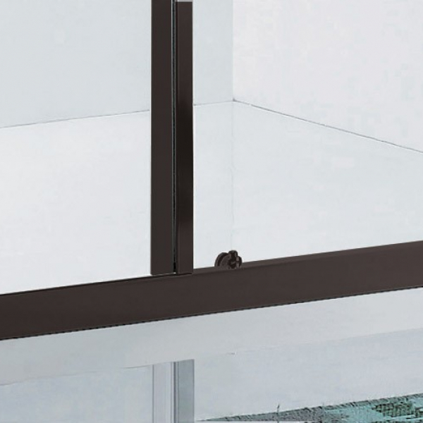 Reversibile apertura scorrevole su carrelli in metallo a doppia ruota con copriruota in teflon, chiusura magnetica, lastre in cristallo temperato da 6 mm Trasparente, dispositivo sgancio con pulsante.