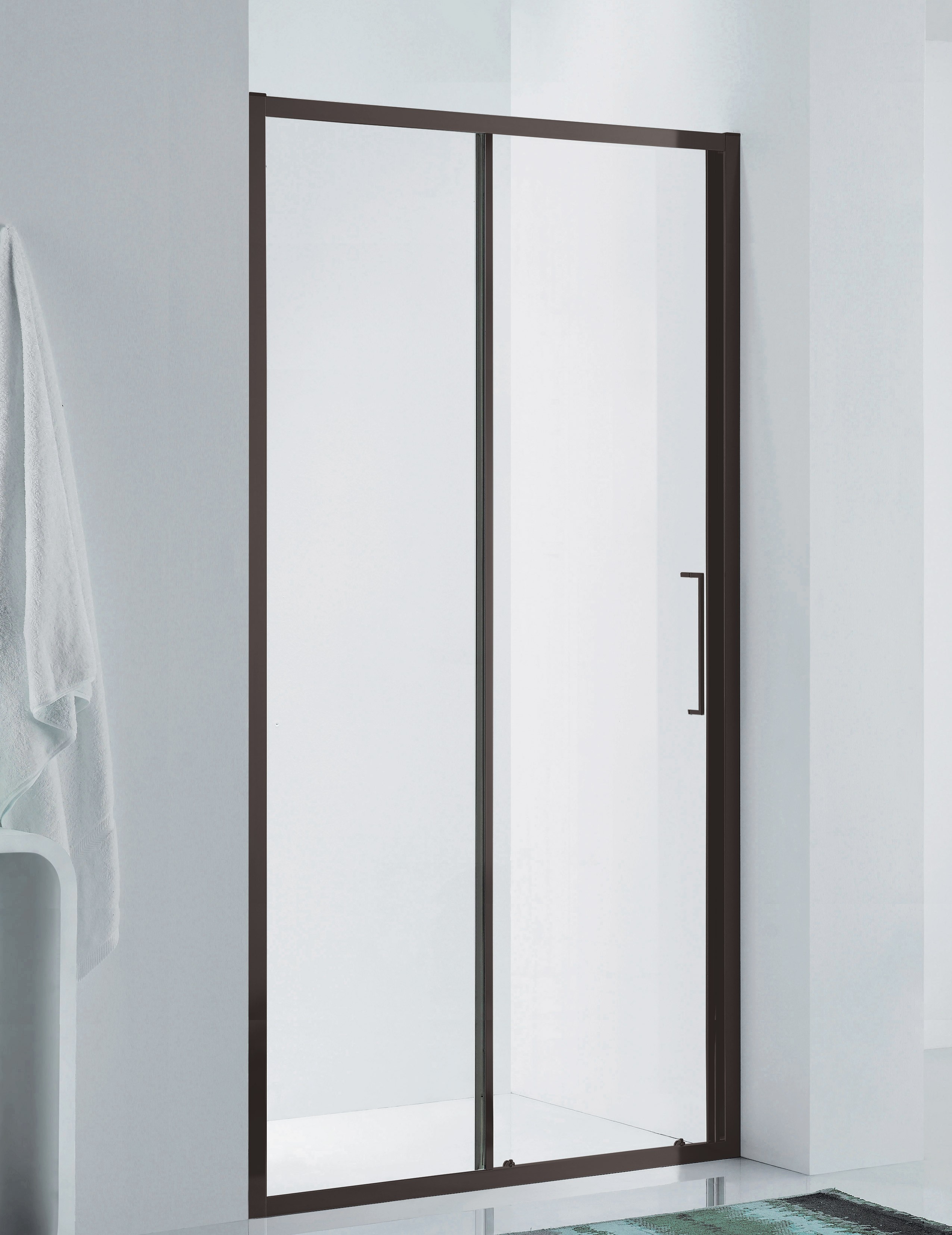 Reversibile apertura scorrevole su carrelli in metallo a doppia ruota con copriruota in teflon, chiusura magnetica, lastre in cristallo temperato da 6 mm Trasparente, dispositivo sgancio con pulsante.