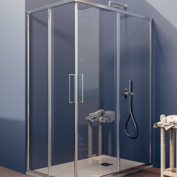 Apertura scorrevole su carrelli in metallo a doppia ruota con copriruota in teflon, chiusura magnetica, lastre in Cristallo temperato da 6 mm Trasparente, dispositivo sgancio con pulsante. Profilo in alluminio minimal 37 mm spessore 1,2mm color Cromo. Maniglie minimal in metallo colore Cromo.