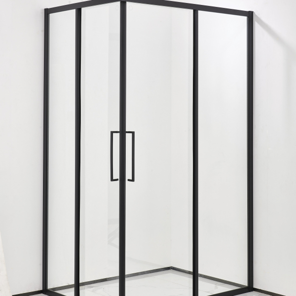 Apertura scorrevole su carrelli in metallo a doppia ruota con copriruota in teflon, chiusura magnetica, lastre in Cristallo temperato da 6 mm Trasparente, dispositivo sgancio con pulsante. Profilo in alluminio minimal 37 mm spessore 1,2mm color Nero Opaco. Maniglie minimal in metallo colore Nero Opaco.