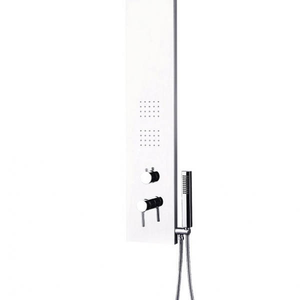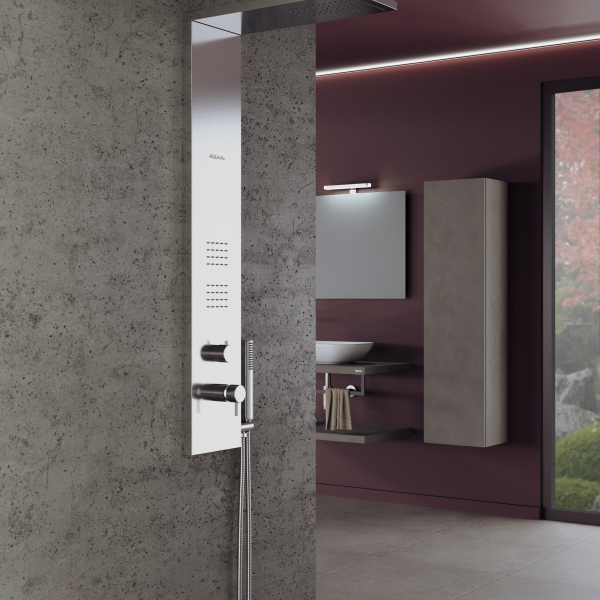 Colonna multifunzione in alluminio, spessore corpo ultra slim di soli 3 cm, completa di miscelatore monocomando meccanico, soffione, cascata, doccetta a mano monogetto, 2 getti orizzontali, flessibile in acciaio inox doppia aggraffatura 1500mm.