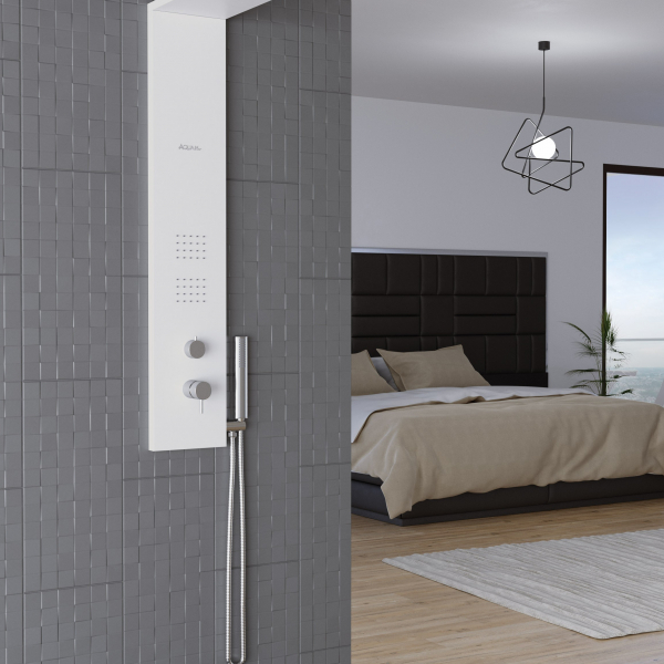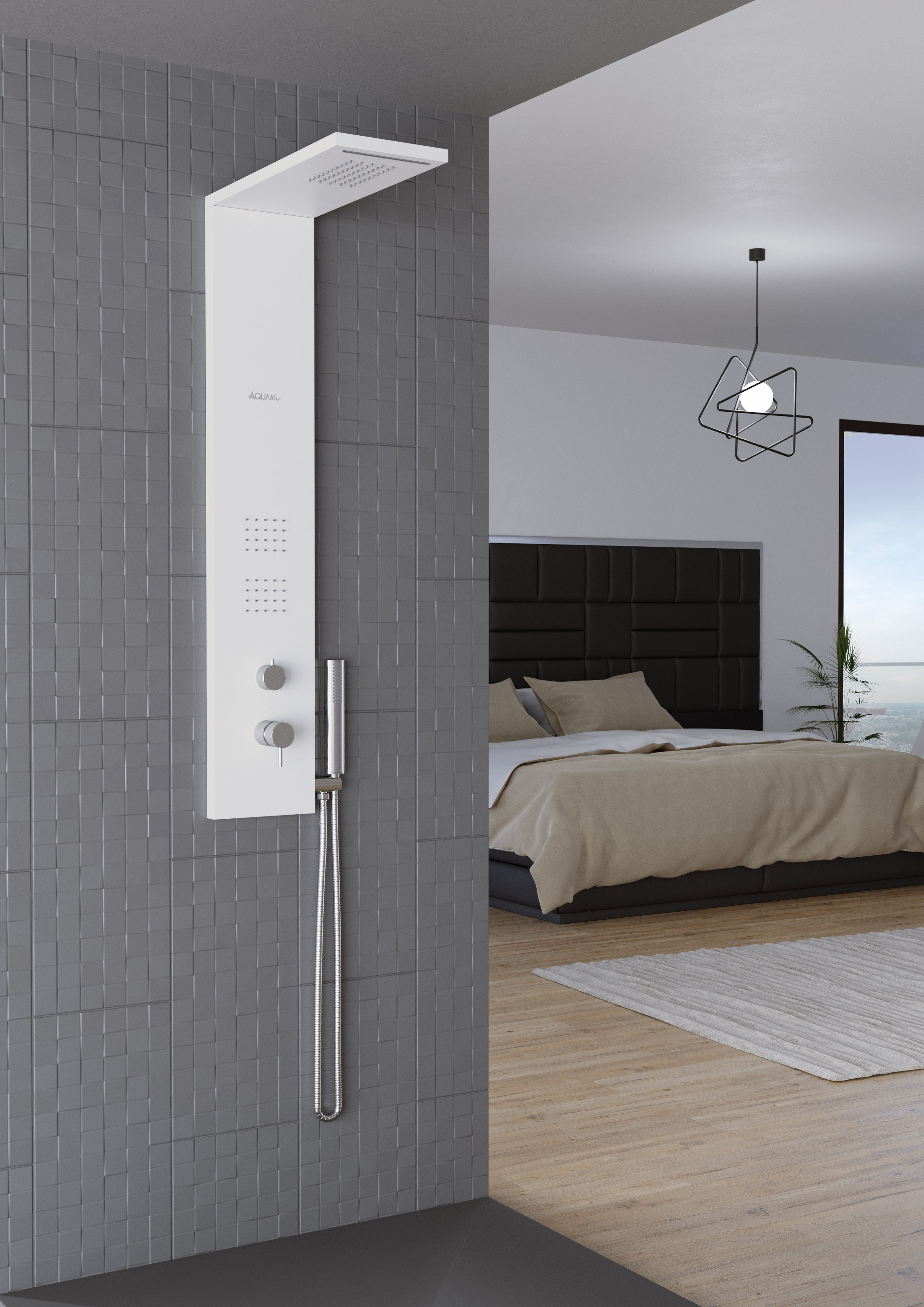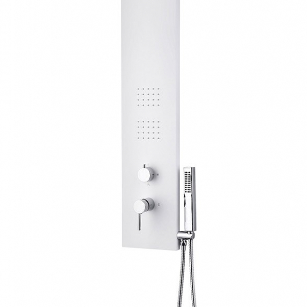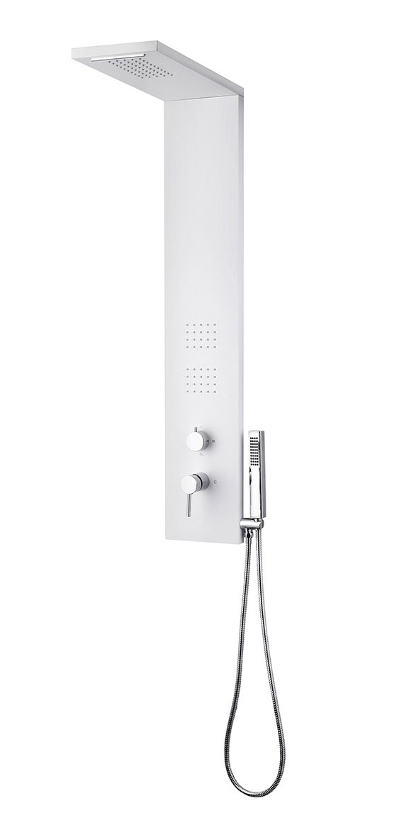 Colonna multifunzione in alluminio, spessore corpo ultra slim di soli 3 cm, completa di miscelatore monocomando meccanico, soffione, cascata, doccetta a mano monogetto, 2 getti orizzontali, flessibile in acciaio inox doppia aggraffatura 1500mm