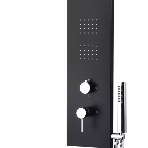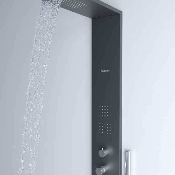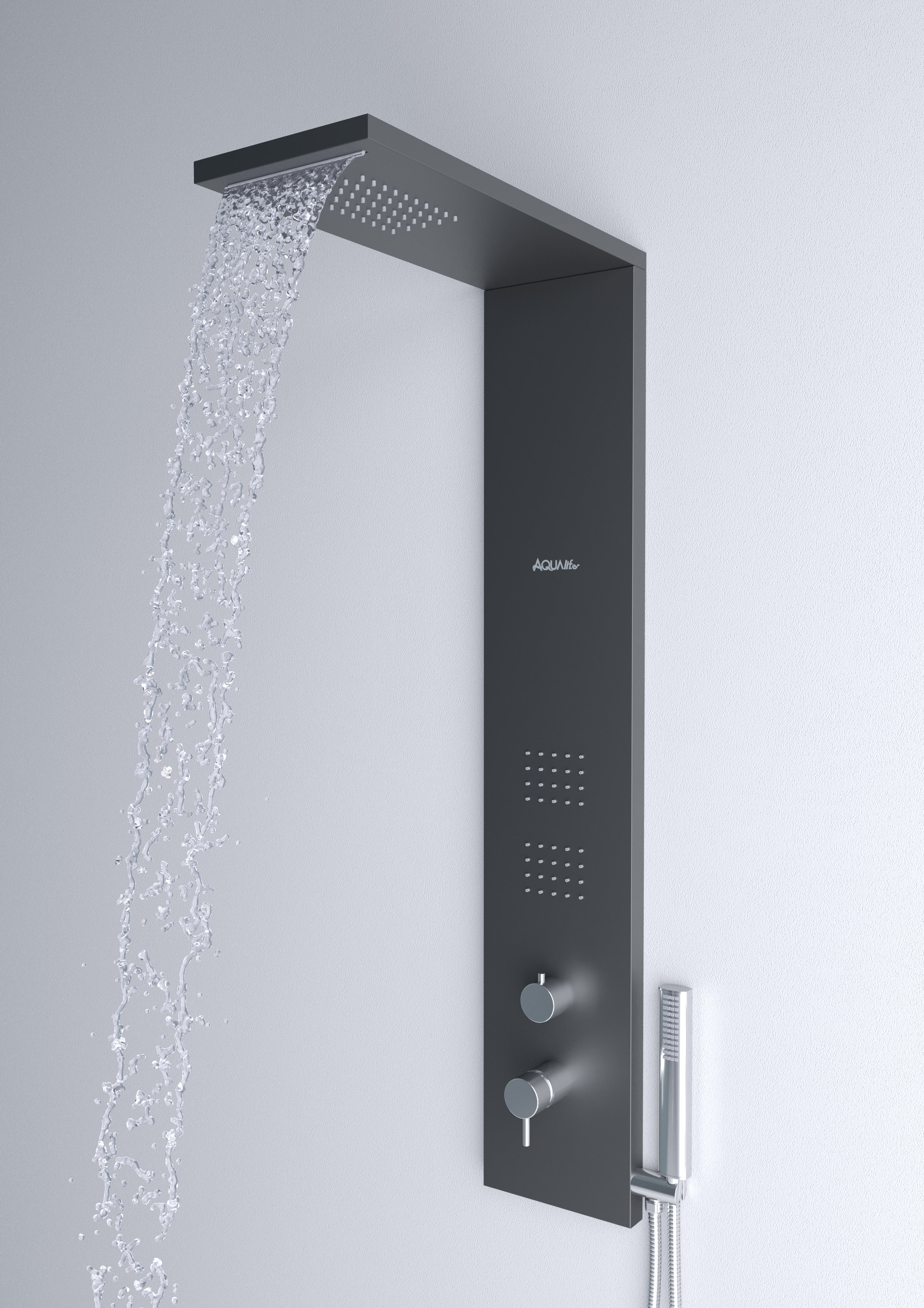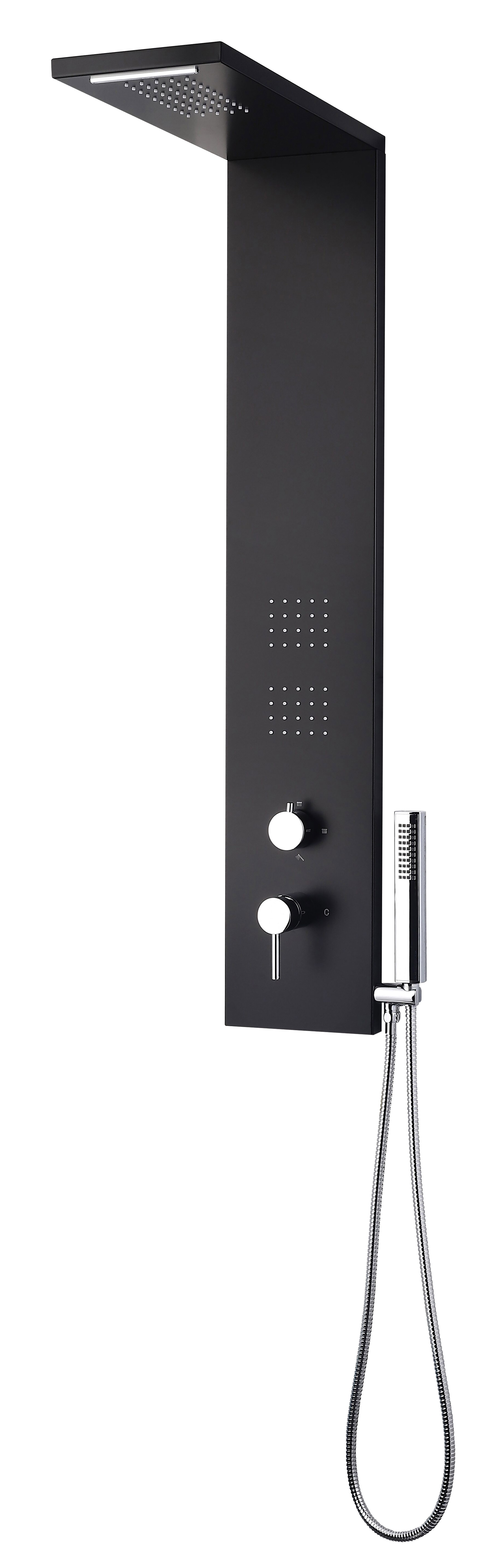 Colonna multifunzione in alluminio, spessore corpo ultra slim di soli 3 cm, completa di miscelatore monocomando meccanico, soffione, cascata, doccetta a mano monogetto, 2 getti orizzontali, flessibile in acciaio inox doppia aggraffatura 1500mm