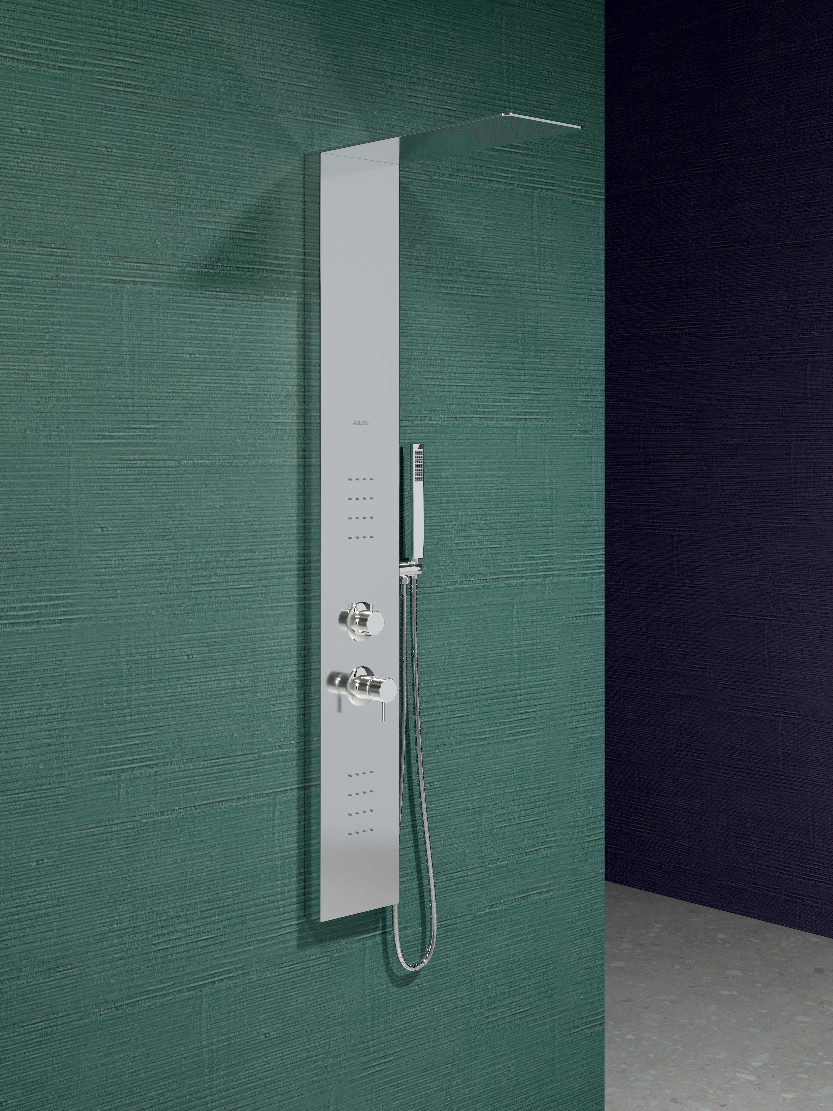 Colonna multifunzione in acciaio inox AISI 304, spessore pannello verticale di soli 4,5 cm e pannello orizzontale che contiene il soffione di spessore di soli 0,5 cm