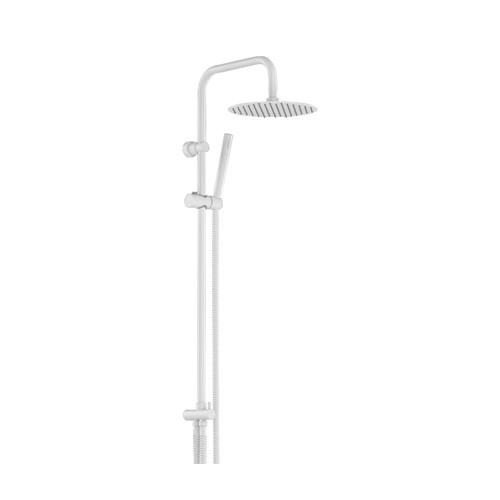 Set doccia LIFE TONDO con asta saliscendi in acciaio con fissaggi regolabili, soffione in acciaio inox AISI 304 misura 25x25 cm, Doccetta monogetto in ottone, flessibile acciaio inox 1500 mm e flessibile di raccordo da 500 mm. H. 103 cm