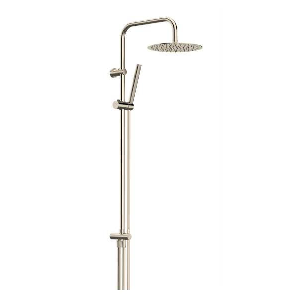 Set doccia con asta saliscendi in acciaio con fissaggi regolabili, soffione in ottone Ø25 cm, doccetta monogetto in ottone, flessibile in pvc 1500 mm e flessibile di raccordo da 500mm H. 103 cm.